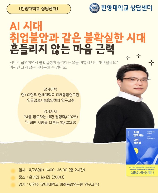 한양대학교에서 진행하는 《AI를 압도하는 내면 경쟁력》 저자 특강을 40명 선착순으로 참여 기회를 드립니다.