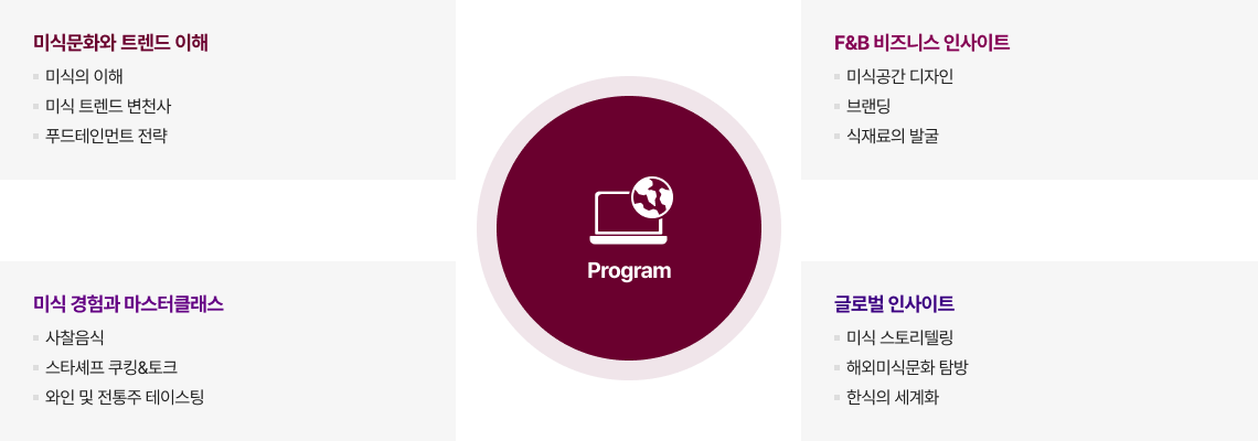 | 5회차 | 4월 14일 | 미식공간 디자인과 서비스 경험 설계 고객 경험과 가치를 높이는 공간 전략 및 사례 | 유정수 대표 글로우 서울 |
